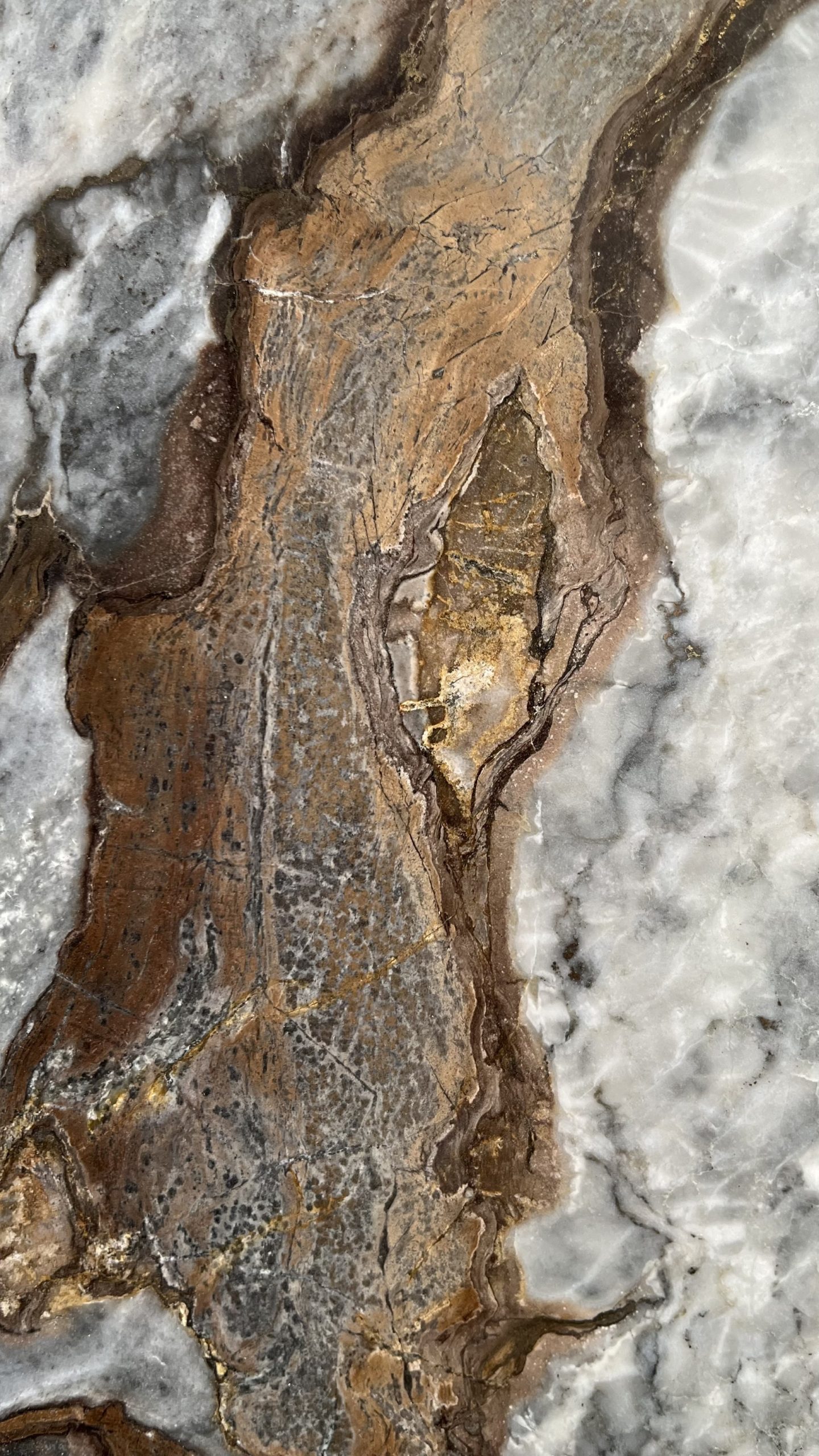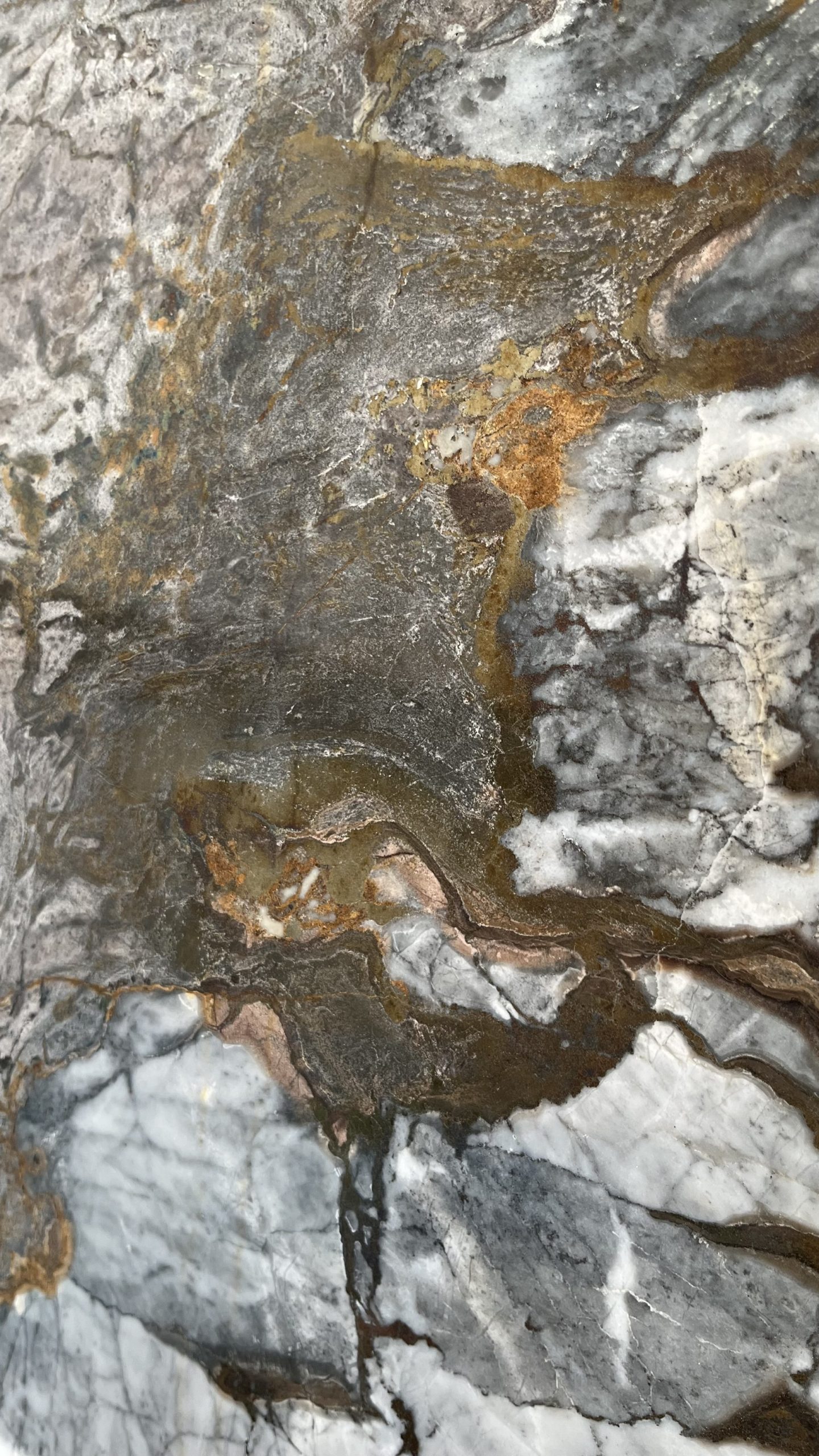 Bring timeless beauty to your home with Golden Hour Marble, an exceptionally rare and exclusive stone. Creamy beige and deep forest green tones are intertwined with browns and taupe greys, accented by metallic gold veins that evoke the roots of an ancient forest. Perfect for custom countertops, kitchen islands, and designer surfaces, this is the only bundle available in the world. Visit True Blue Surfaces to see this unparalleled marble in person.